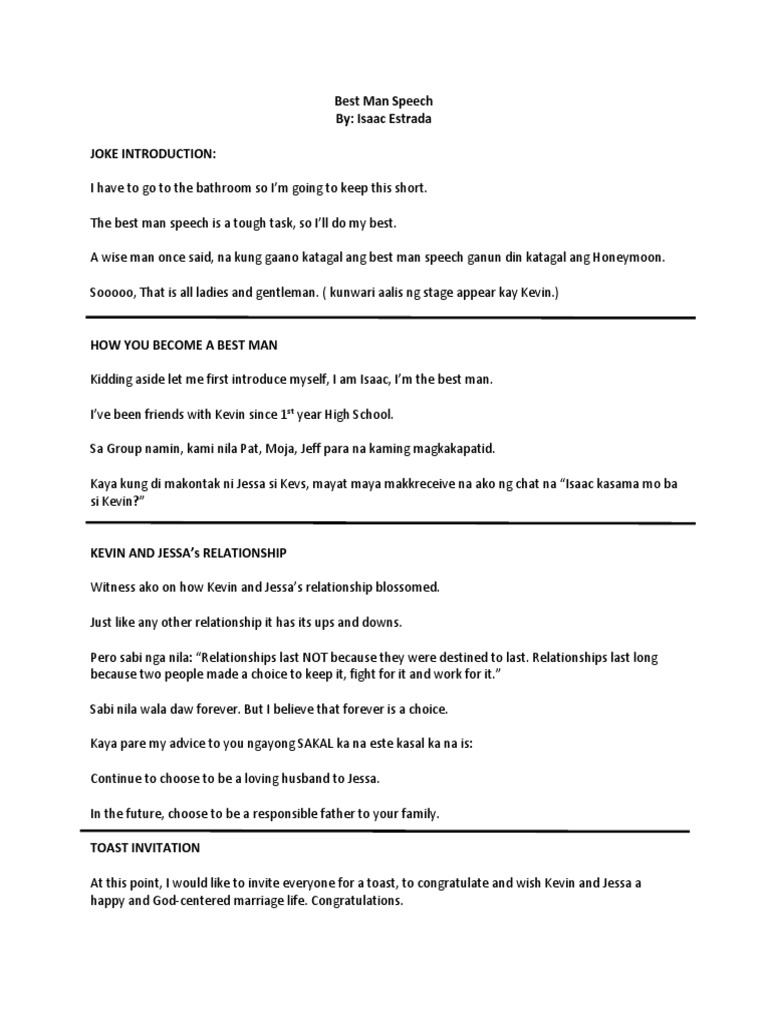 Well, generally speaking, the best man speech tends to include some hilarious outtakes from your time with the groom. Here are examples of best man speeches dos and don'ts. A best man speech example to make your own. You know, it's been said that being asked to be best man is like being asked to make love to camilla parker bowles. How to start a best man speech? Our curated selection of best man material has you covered from the first word to the last, from comedy to tragedy and everything in between. Well, starting a best man speech by giving a formal or not so formal introduction of yourself seems to the safest way to start a best man speech. Meaning that short best man speeches are perfectly fine, you don't have to overthink it. But that's probably not you are keen to know about at the moment. The i'm honored to be the groom best man speech. Plan your speech ahead of time, and be thoughtful, and we are sure that you'll knock it out of the park. Not all of you will know him very well,by the time, i have finished this speech you will wish you did not know him at all. All you have to do here is introduce yourself and say what an honour it is to be saying a few words about the groom.